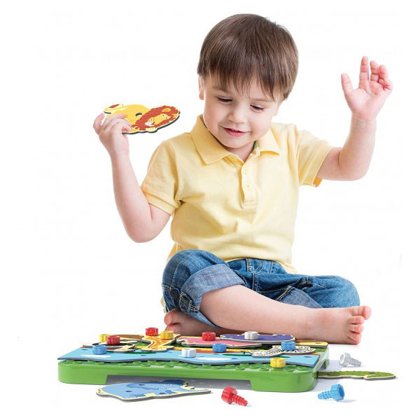 Este o activitate care dezvoltă abilitatea manuală: copilul găsește corespondența dintre găurile din tablă și formele ilustrate, introduce și strânge șuruburile fără a avea nevoie de unelte.